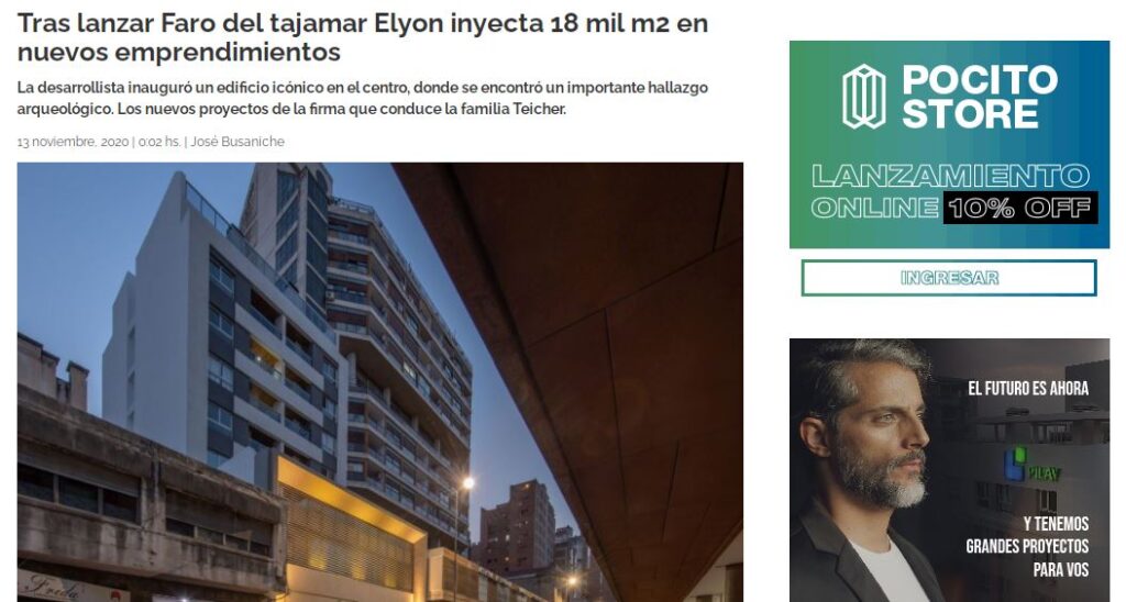 Nuevos proyectos. Faro del Tajamar se suma a otros 9 emprendimientos en desarrollo por parte de Elyon. Este año resta entregarse Aviva Isabella, emprendimiento en desarrollo en conjunto con la empresa De los Ríos; además otros 5 edificios se encuentran en construcción y 3 nuevos lanzamientos se asoman en el horizonte, totalizando más de 18.000 M² de propuestas sólo contabilizando la zona de Nueva Córdoba.